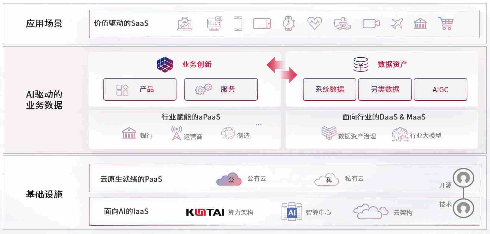 数字时代,,,,围绕企业数字化转型的关键要素,,,,NG娱乐数码开创性的提出数云融合战略和技术体系框架,,,,着力在云原生、、数字原生、、、、AI原生和信创产业上架构产品和服务能力,,,,为处在不同数字化转型阶段的快消零售、、汽车、、金融、、、、医疗、、、政企、、、、教育、、、运营商等行业客户提供泛在的敏捷IT能力和融合的数据驱动能力,,构建跨界融合创新的数字业务场景和新业务模式,,,助力企业级客户建立面向未来的核心能力和竞争优势,,,,全面推动社会的数字化、、智能化转型升级。。。